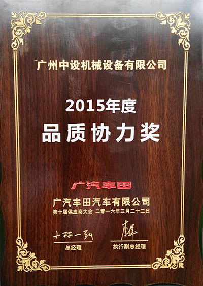 大會同時頒出品質、原價、特別、品質協力獎共181個獎,其中廣州中設機械設備有限公司獲得品質協力獎。作為重要的合作伙伴,這項榮譽是廣汽豐田對廣州中設2015年在產品質量、交付周期、售后服務、技術支持等方面的充分肯定。